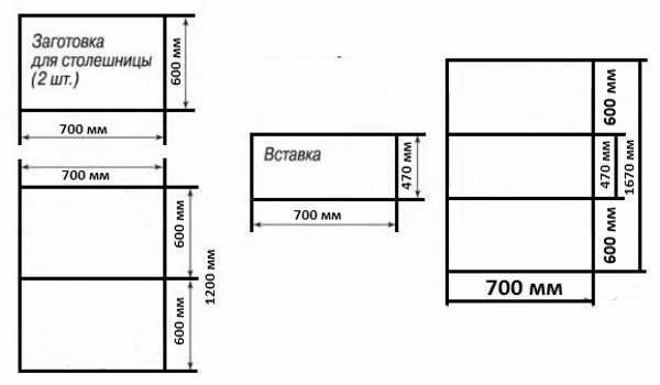 ситуации. Он позволяет ощутимо сэкономить пространство и максимально компактно разместить остальную мебель. Представленный в этой статье вариант раскладного стола имеет устойчивую и прочную конструкцию, достаточно прост в изготовлении и не требует дорогих материалов. Размер столешницы, когда стол сложен 1200×700, если его раздвинуть, площадь увеличивается до 1670 мм, а это еще как минимум плюс два человека поместится за столом.Для увеличения площади столешницы используется специальная вставка, ее размеры и размеры всего стола можно посмотреть на этой схеме.