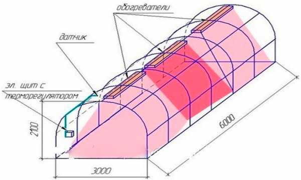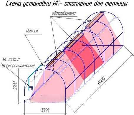 В теплице, по её длине, можно расположить несколько инфракрасных обогревателей, которые помогут обогреть растения. На теплицу шириной 3 метра, длиной 6 метров и высотой 2 метра достаточно будет смонтировать 3 устройства. Обязательно вместе с обогревателями необходимо смонтировать датчик температурный и электрощит с терморегулятором