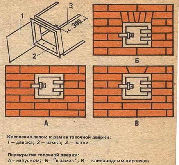 Крепление лапок к рамке топочной дверки: 1 — дверка; 2 — рамка; 3 — лапки.Перекрытие топочной дверки: А — напуском; Б — «в замок»; В — клиновидным кирпичом