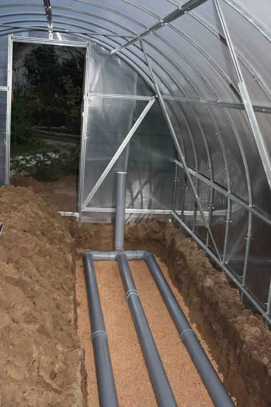 - Одни конец трубы выводят наружу теплицы, а другой оставляют внутри помещения.