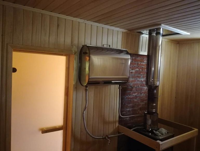 - Встроенное отопление от теплообменника или бака, установленного на главной печке бани;