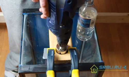 Сверху стекла следует уложить заранее подготовленный шаблон. Далее выливают холодную воду на место, где требуется сверлить. Затем начинают выполнять работу. Для изготовления шаблона можно воспользоваться ненужным стеклом небольших размеров, любой древесиной.