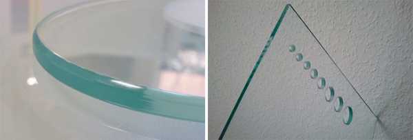 При сверлении стекла близко от его края следует обязательно учесть толщину материала. Если стекло толстое, то отверстия нужно делать, отступив от края на 25 мм, а если оно является тонким, то отступают не меньше 15 мм от края.