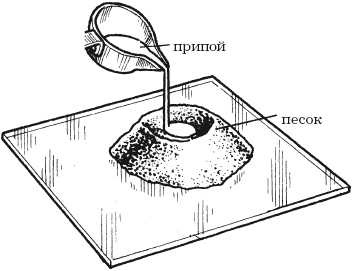 Далее туда заливается припой из свинца или олова, если они уже расплавлены. Они должны быть нагреты до 250-300°С. Когда песок остынет, его следует удалить, извлекая из отверстия припой одновременно с отрезком стекла нужного диаметра.