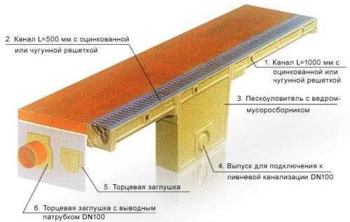 От последнего фактора зависит выбор материала, из которого будет выполнена система. Это может быть пластик (при невысокой степени нагрузки) и сверхнадежный бетон. Рекомендуется также использовать чугунные решетки, способные надежно защитить дренажную конструкцию от деформаций.