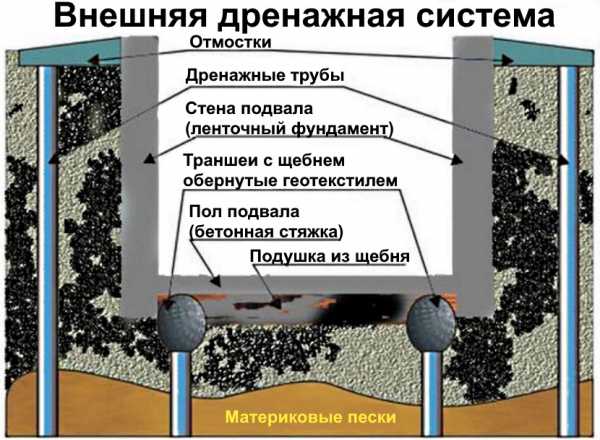 внешний дренаж – располагается по окружности здания и включает в себя траншеи, трубы, для направления воды в скважину.
