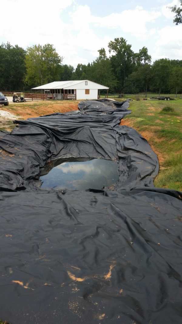 Для устройства озера, в вырытый котлован нужно застелить водонепроницаемую пленку.