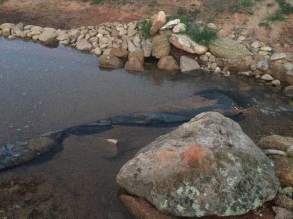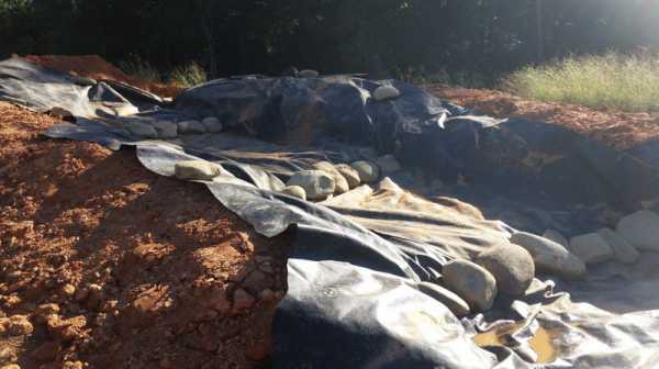 - Для закрепления пленки и обустройства кромки озера, по периметру вырываем траншею и закладываем в нее края пленки, засыпаем щебнем — пленка зафиксирована.