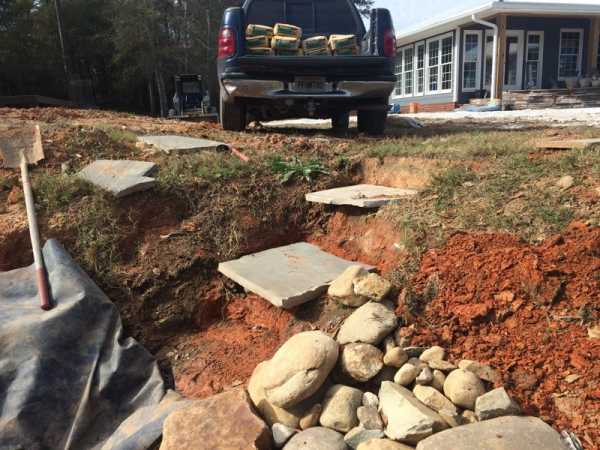 Есть другой способ, более сложный, но в итоге можно будет сказать, что вы все сделали своими руками с ноля. Вам понадобится: лопата, веревка, уровень, колышки, защитная пленка, геотекстильный материал или песок.
