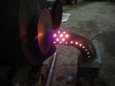 Возьмите болгарку и отрезной круг. Вам нужно будет сделать небольшие отверстия в вытяжной трубе. Шаг между отверстиями — 10 см. Их надо сделать, начиная от корпуса печи и до 50 см высоты трубы. Также в данной трубе на расстоянии порядка 100 см от пола создается аналогичное отверстие, которое будет использоваться для монтажа дополнительного радиатора. Крепление тоже выполняется при помощи сварки. Расположите вторую трубу параллельно полу, вдоль стены.