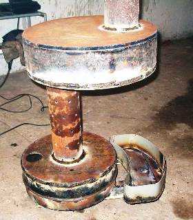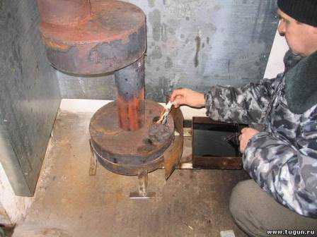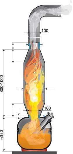 Работает печь следующим образом: отработанное топливо заливается в нижнюю камеру, в которой топливо нагревается, и образуются масляные пары, поступающие в трубу-горелку и воспламеняющиеся под действием кислорода.