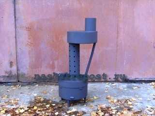 Такая самодельная печь имеет высокую производительность и не занимает много места. вы можете с легкостью сделать ее своими руками из подручных материалов. На лето печку при необходимости можно убрать.