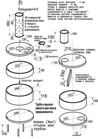 Диаметр трубы с проделанными в ней отверстиями, в которой будут догорать пары масла, может быть произвольным, а сами отверстия – диаметров 10% от диаметра трубы.