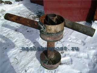 Следующий узел, заслуживающий достаточно пристального внимания – воздуховод, выполненный в виде отрезка стальной трубы, имеющий в верхней части не только приваренную стальную шайбу-крышку, ограничивающую внутреннее пространство дымохода, но и топливопровод, роль которого играет стальная водопроводная труба, оснащенная уголком для присоединения гибкой подводки для подачи масла.