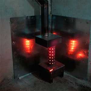 Работает печь следующим образом: масло, залитое в нижний резервуар, нагревается, и его верхний слой через несколько минут начинает закипать, а пары, выделяющиеся при этом, поступают в горелку. Здесь пары обогащаются кислородом и полностью сгорают. Продукты горения перемещаются в верхнюю часть печи, и по дымоходу выходят в атмосферу. Верхний модуль печи нагревается больше других, поэтому его можно использовать, как плиту для приготовления пищи.