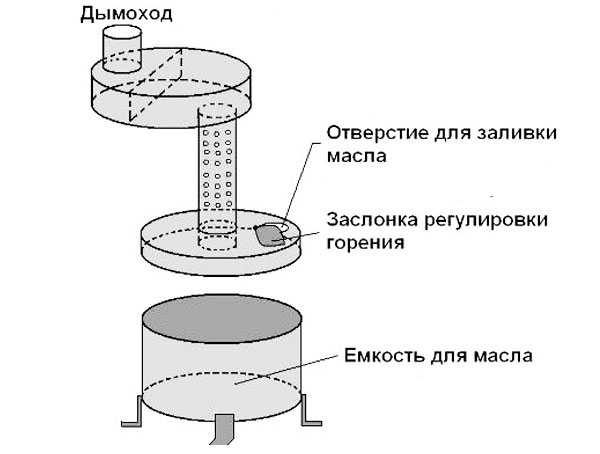 Рассмотрим самую простую и проверенную временем конструкцию печки на отработанном масле. На рисунке предоставлена схема печи на отработке.