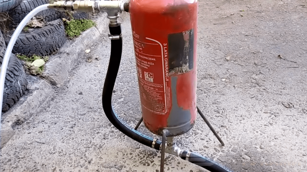 - Основной элемент – рабочая камера. Сделать ее можно из металлического баллона, газового или из-под огнетушителя, как мы уже говорили. С газовым баллоном нужно соблюдать осторожность: перед работой пустой баллон продуть воздухом с помощью компрессора, чтобы убрать остатки газа.