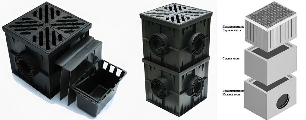 Дождеприемники. Это один из важнейших элементов ливневой канализации, их устанавливают в местах скопления воды – под водостоками с крыш, на непроницаемых для воды площадках (обычно это делается так, чтобы дождеприемник находился под уклоном и вся вода с площадки стекалась именно к нему).