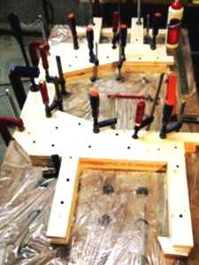 - в процессе склеивания последующих слоев, нехватку струбцин компенсируют с помощью саморезов;
