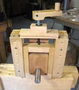 Дальнейшие работы по изготовлению ленточной пилы своими руками связаны с обустройством блока крепления для верхнего колеса. Данный элемент располагается вертикально и обеспечивает натяжение между собой полотен. Для формирования направляющего паза используется дубовый профиль. Блоком называют прямоугольную раму, во внутрь которой устанавливаются подвижные держатели и верхнее колесо. Для изготовления рамы используется именно дуб, из-за его прочности. Для того, чтобы дополнительно усилить угловые соединения применяют вставки. Посл склеивания рамы, внутри нее пропиливаются пазы.