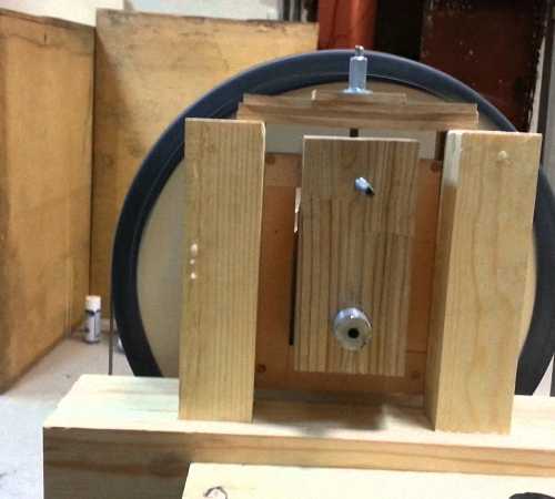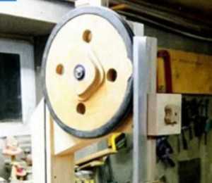 Перед фиксацией фланцев на поверхности колеса устанавливается держатель на нижнем валу. Он имеет форму деревянного бруска, фиксируемого на нижней части рамы. В каждом из колес просверливаются технологические отверстия, во внутрь которых устанавливают струбцины. После завершения работы над колесом, оно фиксируется на валу. Убедитесь в отсутствии биения колеса при его вращении. Для того, чтобы подогнать колесо и сформировать нужный профиль, следует произвести соединение колеса и двигателя.