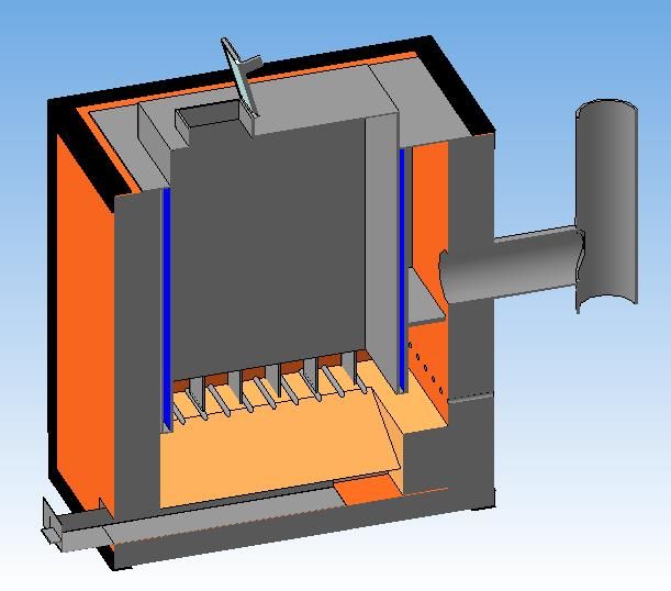 Конструкция котла этого типа использует принцип пиролиза топлива в среде без доступа кислорода. Далее,пиролизный газ, при смешении с кислородом воздуха, сгорает. Недостатком этой конструкции является сложность изготовления котла и необходимость применения электрического вентилятора для подачи воздуха в топку сжигания газа.