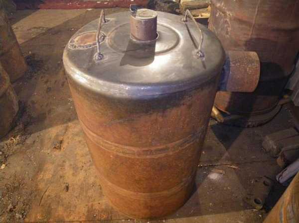 Нам потребуется 200 литровая металлическая бочка. Можно взять готовую, а можно изогнуть и сварить лист стали толщиной 3-4 мм. Срезаем у нее верхний торец и делаем из него крышку, приварив по окружности полоску металла. По центру высверливаем отверстие под воздуховодную трубу. Сбоку в верхней части бочки сверлим отверстие под дымоход и ввариваем в него дымоходный патрубок.