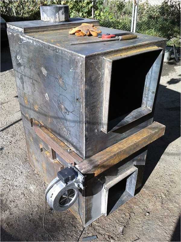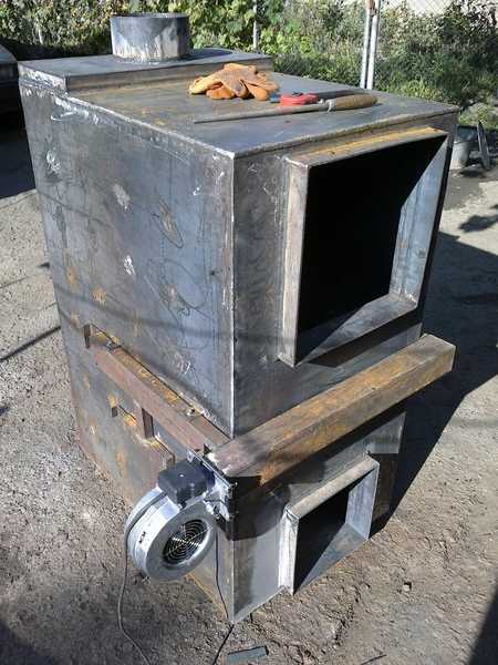 Из основных материалов необходимо купить листовой металл толщиной от 4 мм, металлические трубы диаметром 6 см, огнеупорный кирпич, вентилятор и датчик температуры. Размеры котла следует определить заранее и чем он больше, тем большее помещение можно отопить. Чтобы избежать ошибок при проектировании, опытные мастера используют проверенные, готовые чертежи.