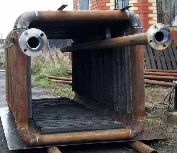 Труба режется на куски одинаковой длины, и они ввариваются в заготовки. Далее он приваривается к котлу.