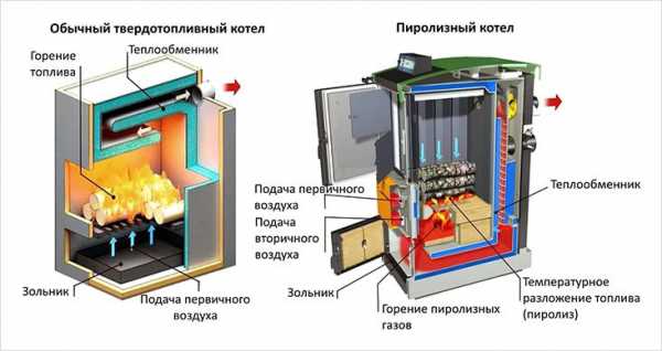 Применительно к отопительным котлам пиролизом называется горение топлива при недостаточном количестве кислорода. При этом топливо выделяет большое количество газов, практически все из них горючие. Эти газы направляются в специальную камеру сгорания и дожига, куда подается вторичный воздух. Газовоздушная смесь вспыхивает, выделяя большое количество тепла. Тепловой энергии выделяется намного больше, чем можно извлечь при обычном горении дров или угля. Дело в том, что многие из образовавшихся при горении топлива летучих веществ, имеют очень высокую температуру сгорания. В результате, из того же количества топлива, пиролизные котлы извлекают больше тепла.