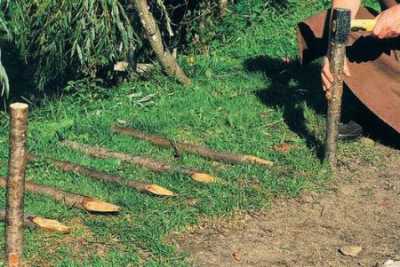- Установка опор. Прутья толщиной 4-5 см вбивают в почву на глубину 40–50 см. Чтобы прутья забивались лучше, нижний конец заостряется. Чем выше забор, тем ниже нужно заглубить опоры. Столбы можно использовать металлические или брусовые: после плетения их все равно не будет видно.