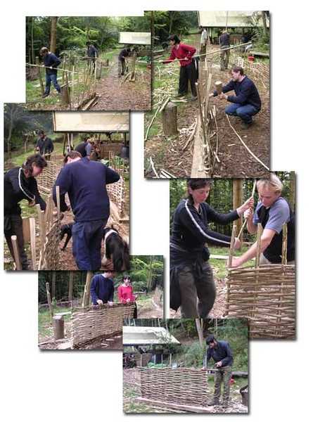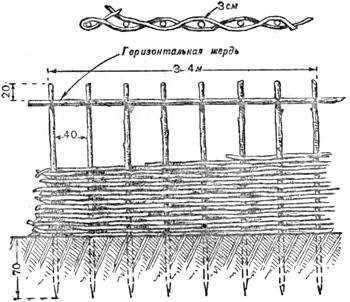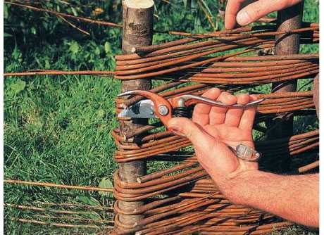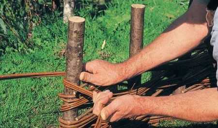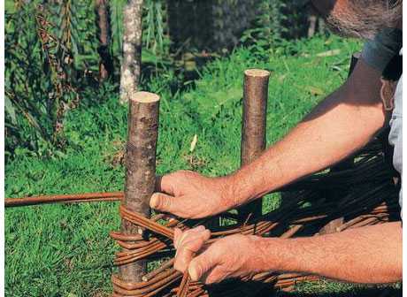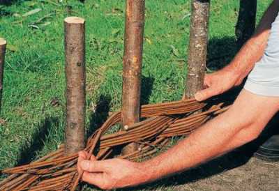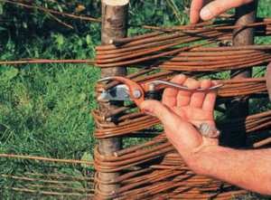 - Между столбами вплетаются прутья. Работу начинают с более толстого конца. Плетение осуществляется по принципу восьмёрки — первый столб обходится спереди, второй сзади, третий снова спереди и т. д. Нижние прутья крепятся к несущим кольям посредством проволоки. Это убережёт плетень от сползания к земле.