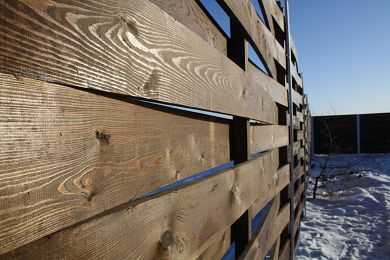 Шаг 7. Чтобы ограждение в деревенском стиле на многие годы сохранило свой первоначальный колоритный вид, желательно обработать натуральный материал морилкой или специальной пропиткой. Достаточно с помощью пульверизатора обработать полотна забора с двух сторон защитными материалами.