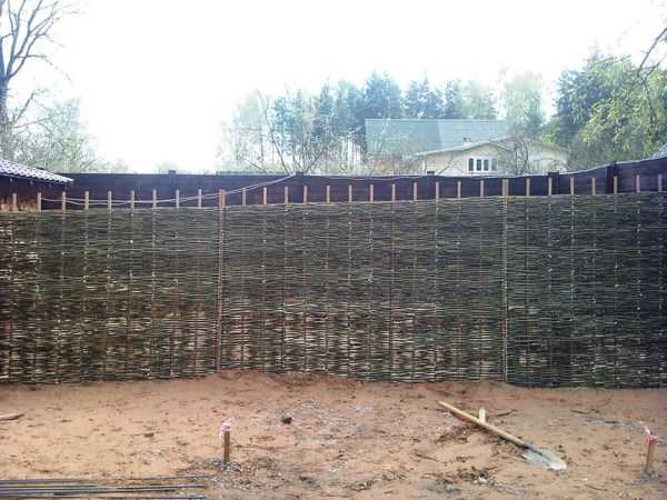 - Установка плетня секциями. Заранее сплетенные полотна располагаются между столбами опоры. Такие секции легче реставрировать или полностью заменить при повреждениях.