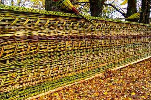 Особенность живого плетеного забора в том, что изгородь начинает постепенно разрастаться и образует достаточно прочное полотно. Ухаживать за забором просто: подрастающие ветки подрезают или придают им новое направление. Хотя такая изгородь защитит территорию не больше, чем забор из штакетника, с годами живой плетень не портится и становится только прочнее.