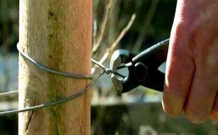 - Перед установкой последнего ряда прутьев снимается фиксирующая планка. Верхний ряд также привязывается проволокой к несущим кольям.