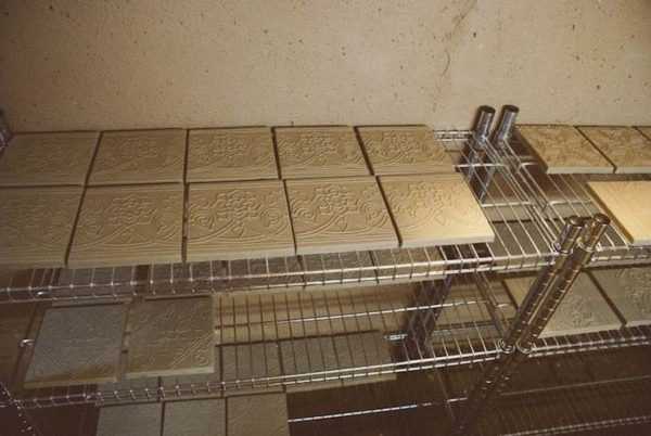 После этой работы заготовку (сырец) требуется основательно высушить. Нужная степень просушка будет достигнута, когда плитка посветлеет и затвердеет. Здесь очень важно соблюдать осторожность, поскольку сырец на данной стадии довольно хрупкий. Но если случится какой-то промах, формовку и просушку можно устроить снова. Для этого заготовку можно размочить в воде.