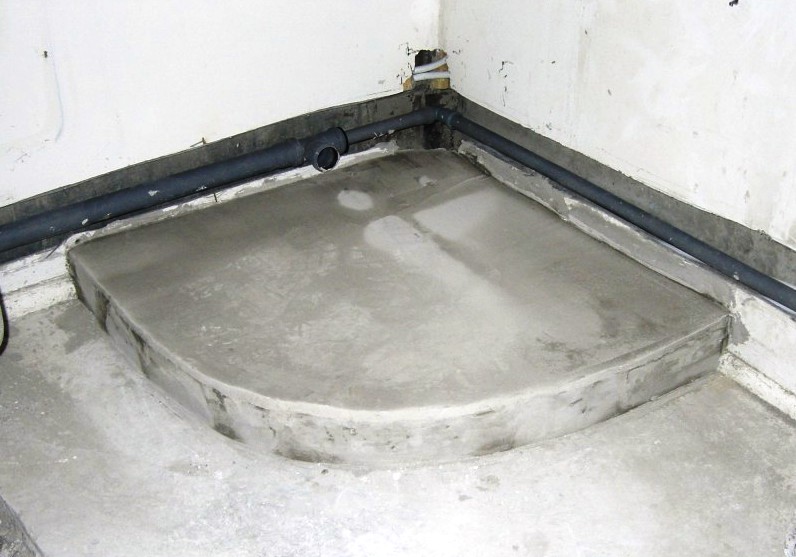 Ответ: По-простому — это бетонное сооружение с установленным душевым трапом (или душевым лотком). Может быть самой разнообразной формы и состава. Классический «пирог» строительного душевого поддона представлен на фото: