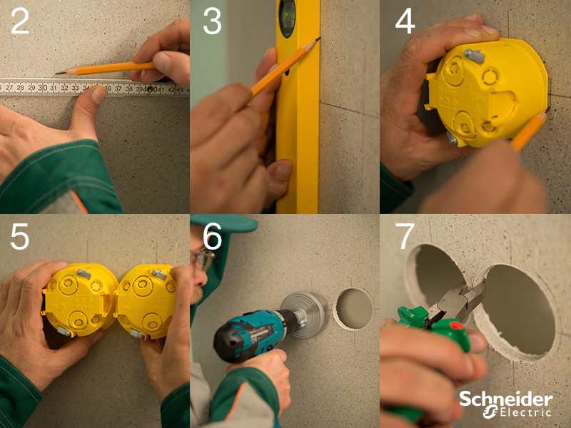 После окончания работ по разметке трасс электропроводки и мест установки коммутационной аппаратуры, начинается этап высверливания ниш для подрозетников или как их правильно называют производители — коробок установочных круглых наборных без крышки.