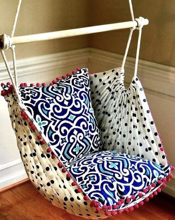 Не менее удобные и практичные, но более привлекательные в плане самостоятельного изготовления бескаркасные варианты заслуживают особого внимания. Для изготовления качели на шнурках сгодится любой плотный текстиль. Особой же эффектности креслу-гамаку придаст трикотаж. Если в доме есть мастера макраме, то можно создать даже впечатляющие своей «воздушностью» конструкции.