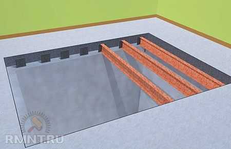 Балки для обвязки устанавливаются непосредственно на арматурные штыри и надежно фиксируются на них. При этом балки должны быть обработаны пропитками и полностью гидроизолированными. На обвязку укладывают балки перекрытия с интервалом 0,5-1м. Затем на них настилают половые доски.
