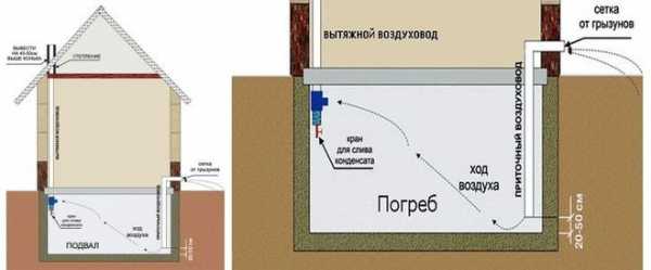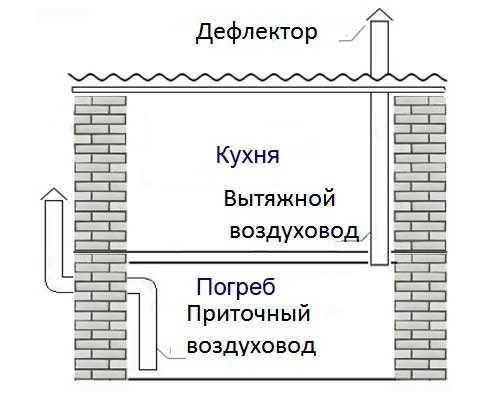 Для нормального функционирования погреба в нем должна быть приточная и вытяжная вентиляция. Для этого в противоположных углах хранилища устанавливают две трубы, конец одной из которых находится ближе ко дну погреба (20–50 см от пола), а другой — ближе к потолочному перекрытию.