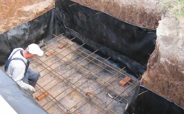 После того как яма будет выкопана, ее дно тщательно утрамбовывают и насыпают на него песок около 15см. Его необходимо хорошенько утрамбовать. Далее укладывают щебень толщиной не менее 5см и проливают его жидким расплавленным битумом. На него стелят рубероид с нахлестом на стены не менее 20см. Затем все проливают пятисантиметровым слоем подбетонки. Далее заливают основание бетоном полностью (с армированием).