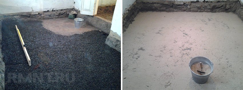 Выравнивают его при помощи цементно – песчаной смеси и заливают применяя при этом маячки.