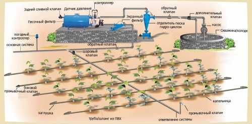 При монтаже капельной системы полива используются ПВХ трубы для магистрального трубопровода и тонкостенные полиэтиленовые трубки для ответвлений. В разводку также входят: