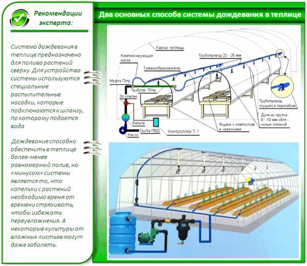 Виды систем полива и их конструктивные особенности В зависимости от потребностей растений во влаге и состава почвы, существует несколько способов организации полива, отличающихся способом подачи воды. Параллельно можно организовать систему полива двух и более теплиц.