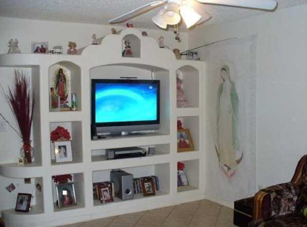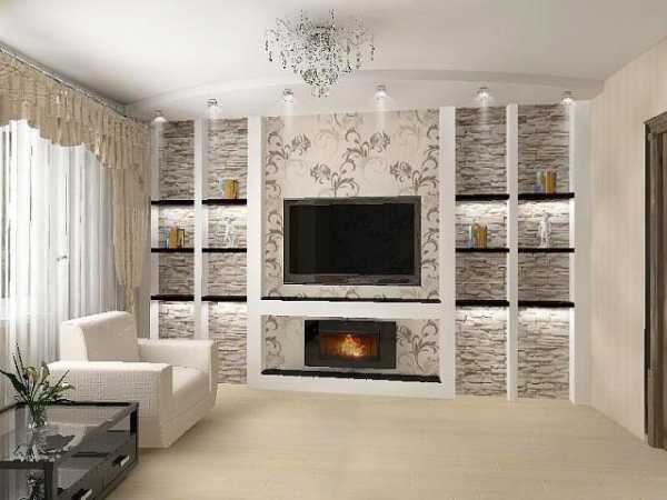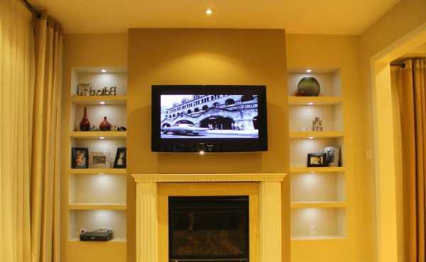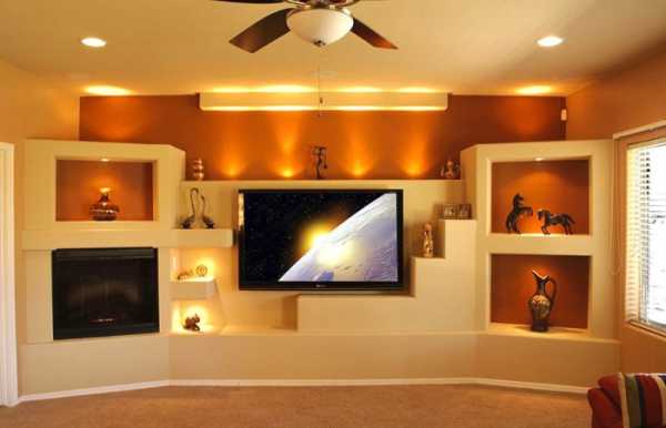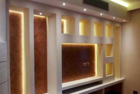 - Полки под телевизор или другую технику. Во встроенных нишах в гостиной можно разместить всю аудио и видеотехнику. Это существенно сэкономит место. Такие ниши могут быть как с подсветкой, так и без нее.