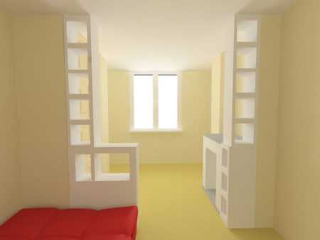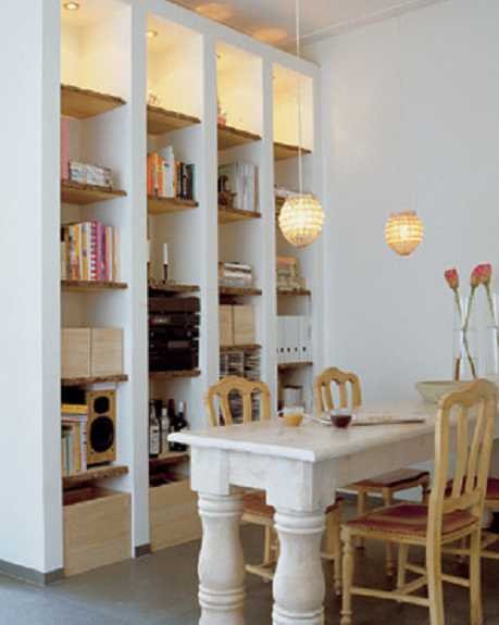- Полка-перегородка. Это отличное дизайнерское решение для однокомнатных или малогабаритных квартир. С помощью таких перегородок можно отделить рабочую зону от жилого помещения. В таких перегородках могут быть встроены ниши и полки, что делает их функциональными.