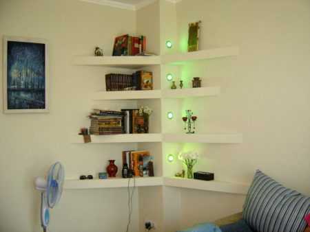 - Угловые полки. Такая конструкция является важным элементом в декорировании интерьера. Такие полки можно сделать в ванную комнату или маленькую спальню.