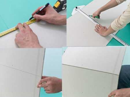 Нож для резки ГКЛ нужно ровно установить на поверхности и углубить сквозь все наполнение, не прорезая противоположный лист картона.